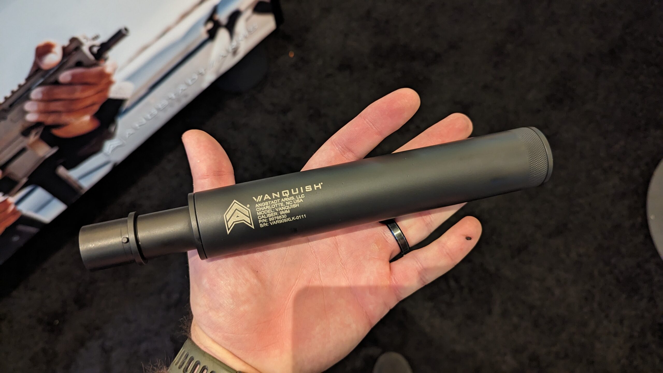 I was baffled by the baffleless suppressor that’s currently being produced by Angstadt Arms. Okay, I’ll admit that’s not my joke, but the guy at the Angstadt Arms booth hit me with it. The Vanquish did seem somewhat confusing to me. I’m no suppressor expert, but I thought baffles were kind of a requirement.