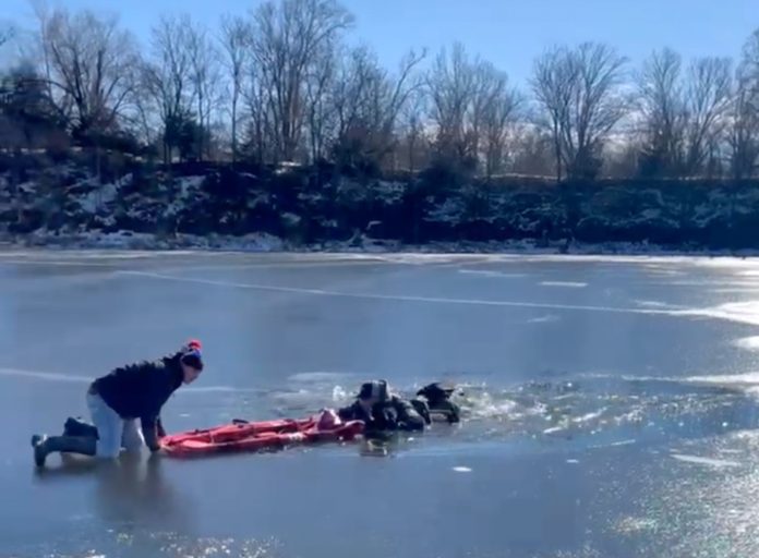 With the older brother holding McIntosh’s hand, they formed a two-man chain while McIntosh threw the roughly 7-foot-long tent bag toward the hole in the ice. The angler grabbed ahold of the bag, and they slowly pulled until he could crawl across the lake’s surface. McIntosh yelled at him to keep crawling, but the man didn’t listen (or didn’t hear him) and stood up instead.