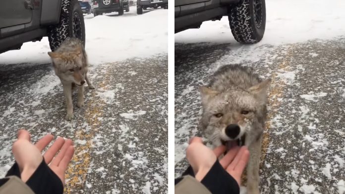 The video was reportedly filmed in the parking lot at Mammoth Mountain during what looks like a pretty killer powder day. “Come here. It’s cold, I know, you’re freezing,” says the guy behind the camera, recording as he beckons to the tail-tucked coyote. “You’ve got a lot of fur, though.”