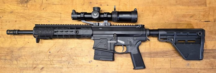 I mounted the AMS and Enhanced grip on my Aero Precision M5 .308 SBR with 12-inch barrel, and a Swampfox Tomahawk LPVO. Swapping out stocks and grips was straightforward and only took a couple minutes. I liked the vibe of the AMS and grip on my mini marksman rifle. It seemed to fit the build well, so it checked that box off right away. The stock fit nicely on my receiver extension. It adjusted smoothy, and didn’t have any rattle to it. The friction points Amend2 discusses seem to work to eliminate play and rattle. At the same time it’s not so snug that it’s hard to adjust. I’ve had stocks fit so tight before that I had to practically beat them to get them to move. This is nowhere near like that. It operates smoothly, but locks up securely. The recessed release lever is easy enough to use. It isn’t quite as fast to engage as a an M4 lever, or a Magpul MOE lever, but it is much less likely to get bumped inadvertently.