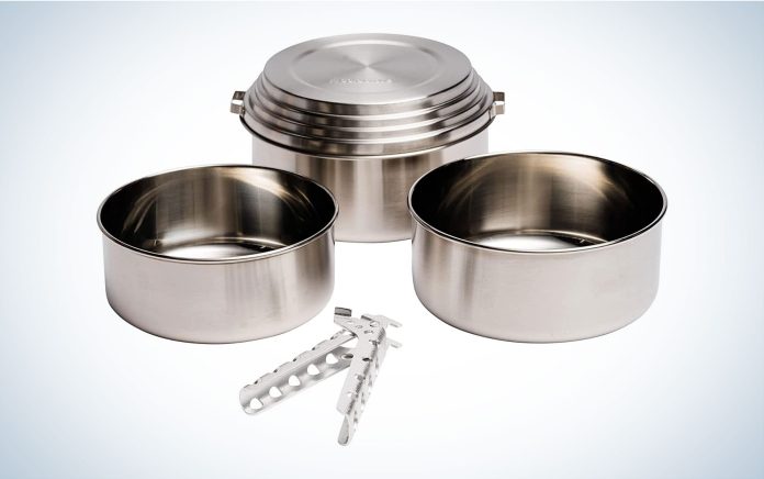 Get the Solo Stove 2 stainless steel pot set for $52. One pot is 3 liters and the other is 1.5 liters. Both have lids, and they nestle together for easy storage.