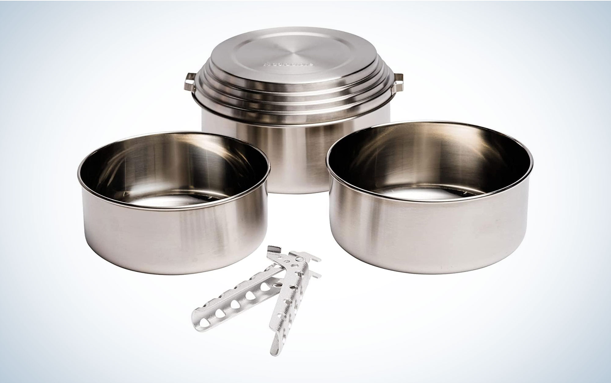 Get the Solo Stove 3 Pot Set of stainless steel camping cookware for $45. The classic pots nestle in each other, include a lid that doubles as a plate, and an aluminum pot gripper.