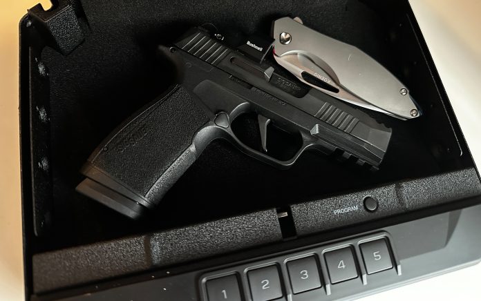 If your goal is to keep a gun out of the hands of untrained family members, while still having quick access, this biometric sliding safe is a good option. It mounts to furniture or a wall with supplied screws. Keep in mind the safe is about as discreet as a bowling-ball-sized goiter, so you’ll need to carefully place it if stealth is important to you.