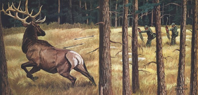 We returned to the tent, prepared some food, and were adjusting our elk calls when we heard a faint bugle on the nearest ridge. We didn’t pay much attention — until the bellowing whistle sounded again. That time it was so close that we scram bled for our bows.