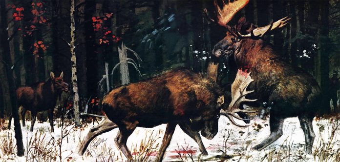 I crept closer, climbing up the steeper slope away from the willow swamp until I came into an area that was half meadow, half heavy timber. The clashing of antlers was unmistakable. I peered through the trees and saw a spectacular sight. The young bull I’d been hunting was larger than I had suspected. He was standing 30 yards away and facing a huge older bull. Both were pawing the ground and snorting. The larger bull was defiant and was swinging his magnificent antlers from side to side. A cow moose stood by, apparently unconcerned.
