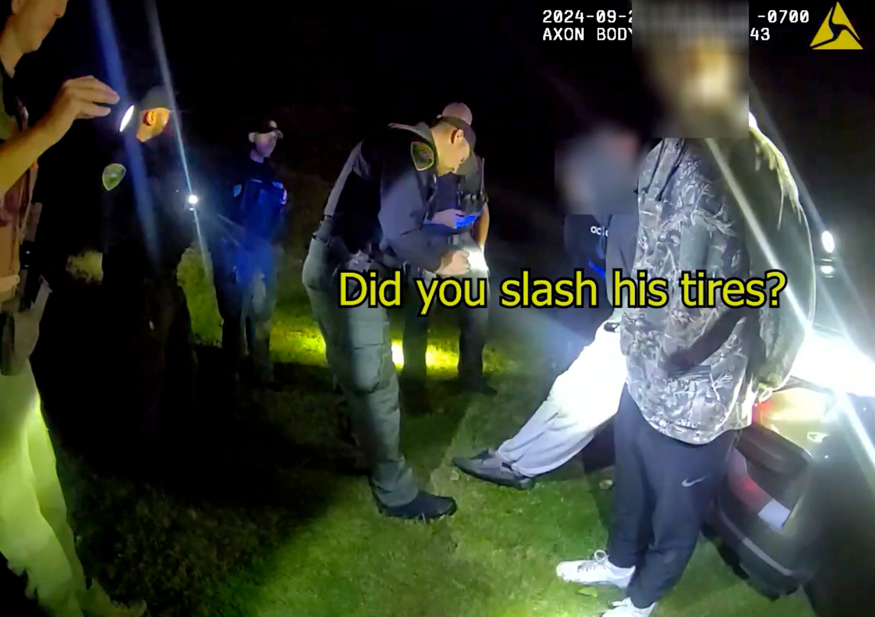 The body-cam footage resumes with Corey standing on one side of the road as the 15-year-old suspect stands on the other side. The truck comes to a sudden stop between them, possibly to allow the 15-year-old to hop in on the right side of the truck. Corey acts quickly, pulling his knife and puncturing the truck’s left rear tire. The hissing sound of the deflating tire is audible as the truck drives away.