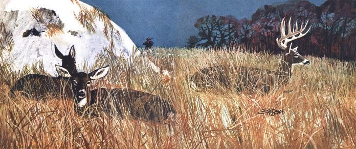 Again I turned my attention to deer hunting. I moved ahead slowly until I was within 45 yards of the dozer pile. As I intently scanned the area, I saw through the grass an object resembling a deer’s head, facing to my left. I slowly raised my binoculars. Suddenly I went tense. Though the antlers blended very well into the background, I was now seeing exactly what I had hoped to see for four hunting seasons.