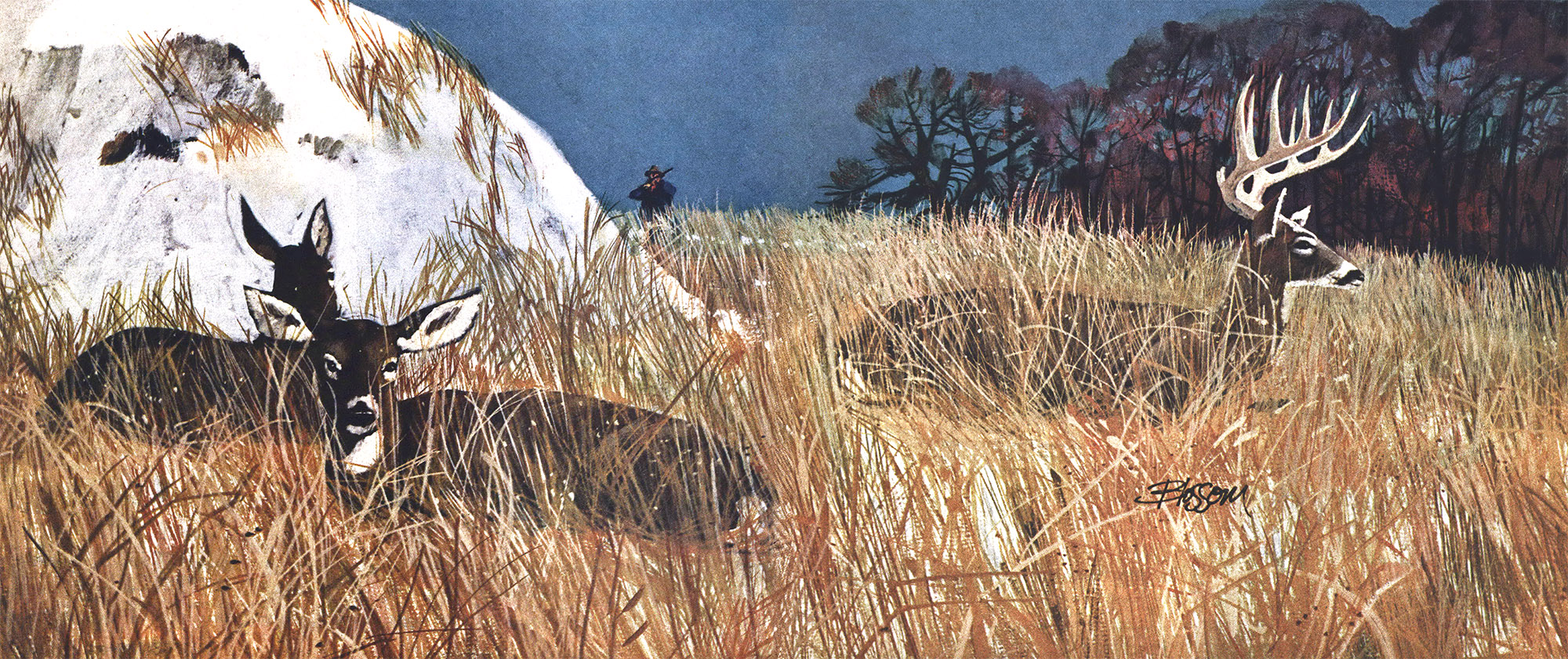 I slowly lowered my glasses. Then I raised my gun to my shoulder, simultaneously releasing the thumb safety. I zeroed in on the center of the buck’s neck, six inches below his skull, and squeezed hard. He was at the edge of six-foot-high weeds that encircled the dozer pile. The gun cracked, and the buck disappeared. I chambered another shell and waited. At the far side of the dozer pile a doe leaped out and headed across the field. A second and a third doe followed her. Then all was quiet.