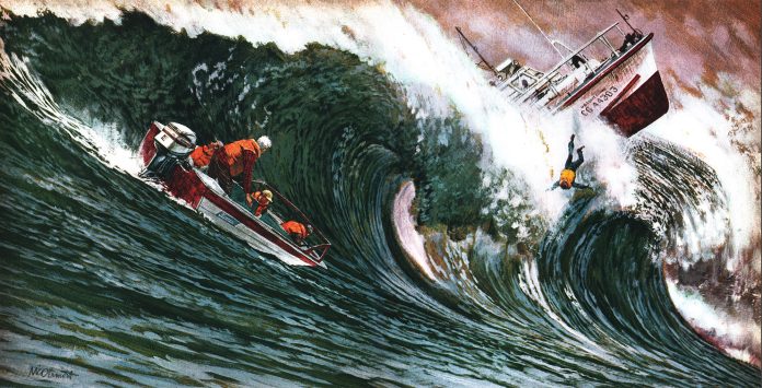 I remember Oswald Petersen standing erect in our boat, frozen with fear and horror. I gunned the outboard wide open and skidded around in a desperate attempt to outrun that murderous wave, but before we could even be sure whether the Coast Guard boat was still afloat, the sea crashed down on us like a monstrous trip hammer.