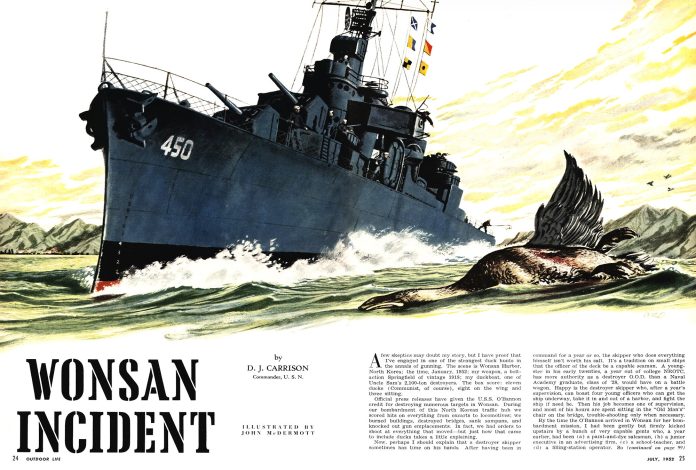 This story was originally published as “The Wonsan Incident” in the May 1951 issue of Outdoor Life. The author, Daniel Jordan Carrison, served in World War II and was awarded the Bronze Star Medal with Combat “V” for “meritorious service as Gunnery Officer of the USS Yorktown, during operations against enemy Japanese forces on the Japanese Mainland” in summer 1945. This story, however, was written during his post as Commanding Officer of the USS O’Bannon from December 4, 1951 to April 2, 1953 in Korea. His service there earned him a Gold Star.