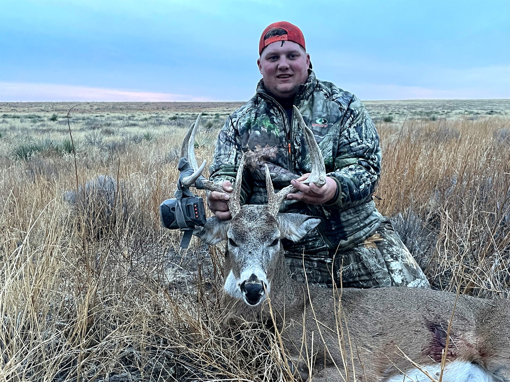 Determined to get his camera back, Mitchell dropped down into a draw and got within 80 yards of the buck. He didn’t have a great shooting lane—the buck’s body was covered up by milo stalks—but he pulled the trigger anyways and the bullet connected. The shot hit a little farther back than he would have liked, but the buck expired after a 200-yard sprint, and Mitchell walked up to find his trail camera wrapped up around its right main beam.