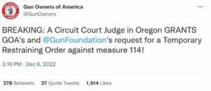 The supreme court refused, however, leaving our hard-fought win in place. This means that Oregon’s gun control law, which was supposed to go into effect last Thursday, remains blocked thanks to our lawsuit!