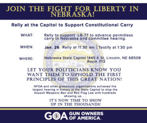 It is imperative that GOA members attend the rally and Senate Judiciary Committee hearing in mass on the 26th of January. The rally begins at 11:30 AM and the hearing follows at 1:30 PM in Room 1113. Let’s show up in large numbers to show our support for Nebraska permitless carry!