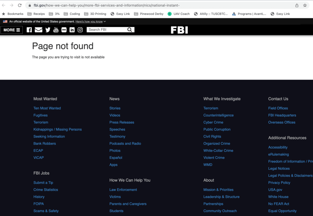 AmmoLand News read through the document provided to us by the ATF to contact the FBI about the ‘open’ background check. We tried to follow the procedure, but the link in the document where we could reach the FBI returned a “page not found.” After examining the document, we were able to determine there is a white space in the link. A white space refers to a blank space and is invalid in URLs. We were able to figure out the correct link and complete the process.