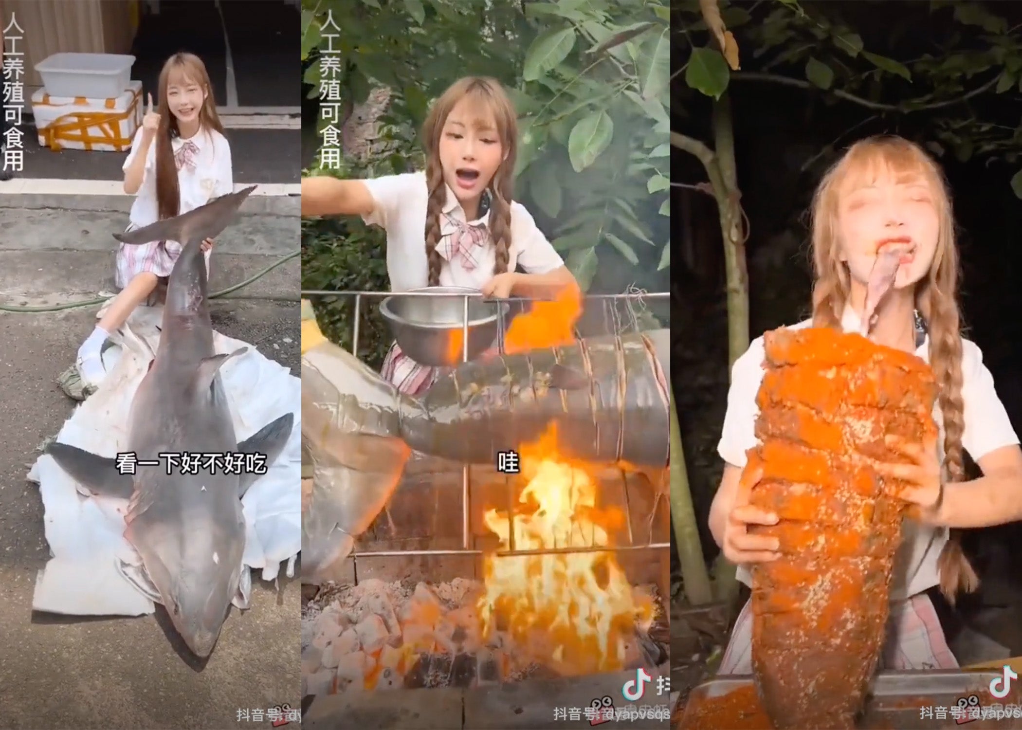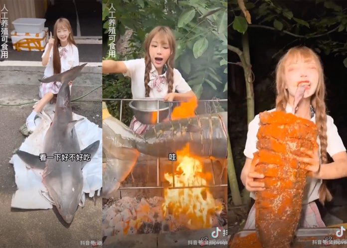 Chinese video blogger “Tizi” faces stiff fines for filming herself cooking and eating a great white shark. via Douyin